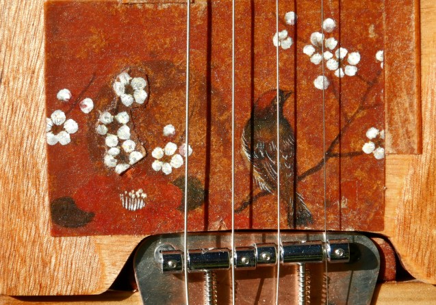 The piezo I salvaged from a BBG cigar box guitar kit and it sounds surprisingly good, but naturally acts as a loud drum when any part of the box is inadvertently tapped or scraped. Or breathed on.
