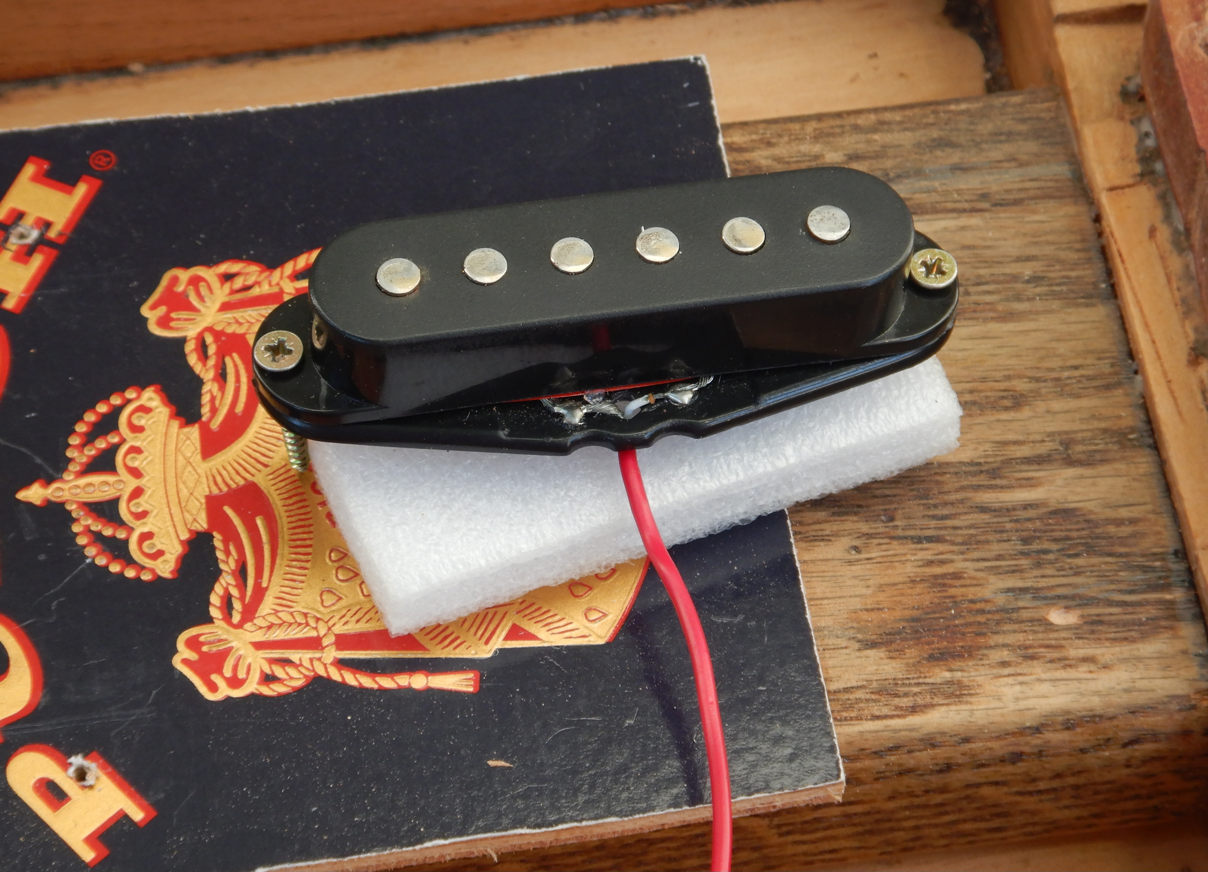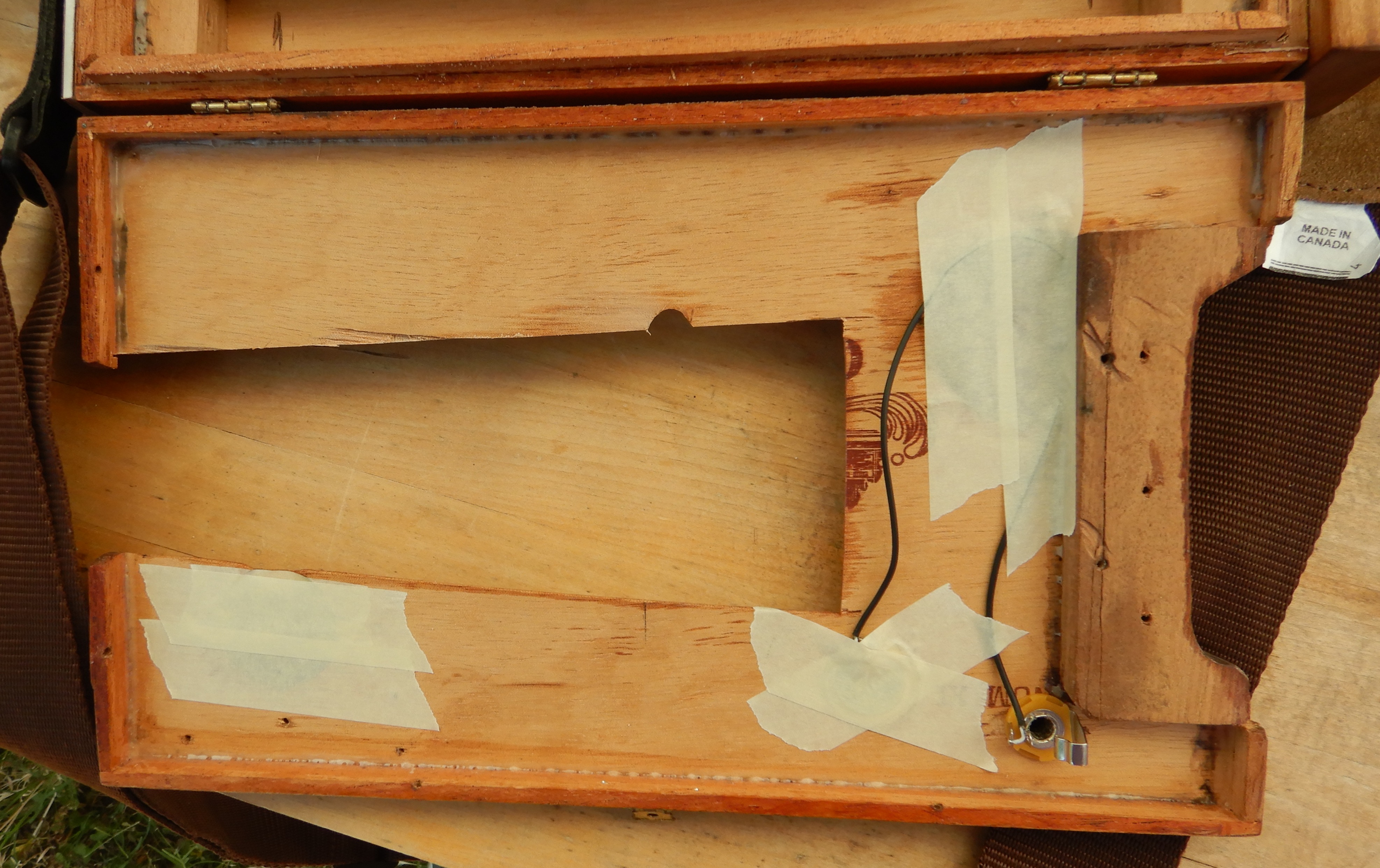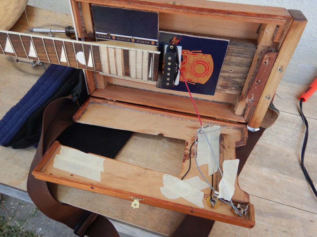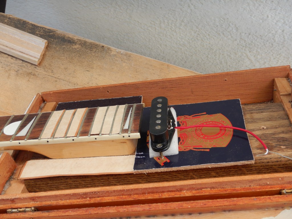Today I installed both a salvaged magnetic straight coil pickup, and a second, piezo electric one in my piccolo bass cigar box guitar project.