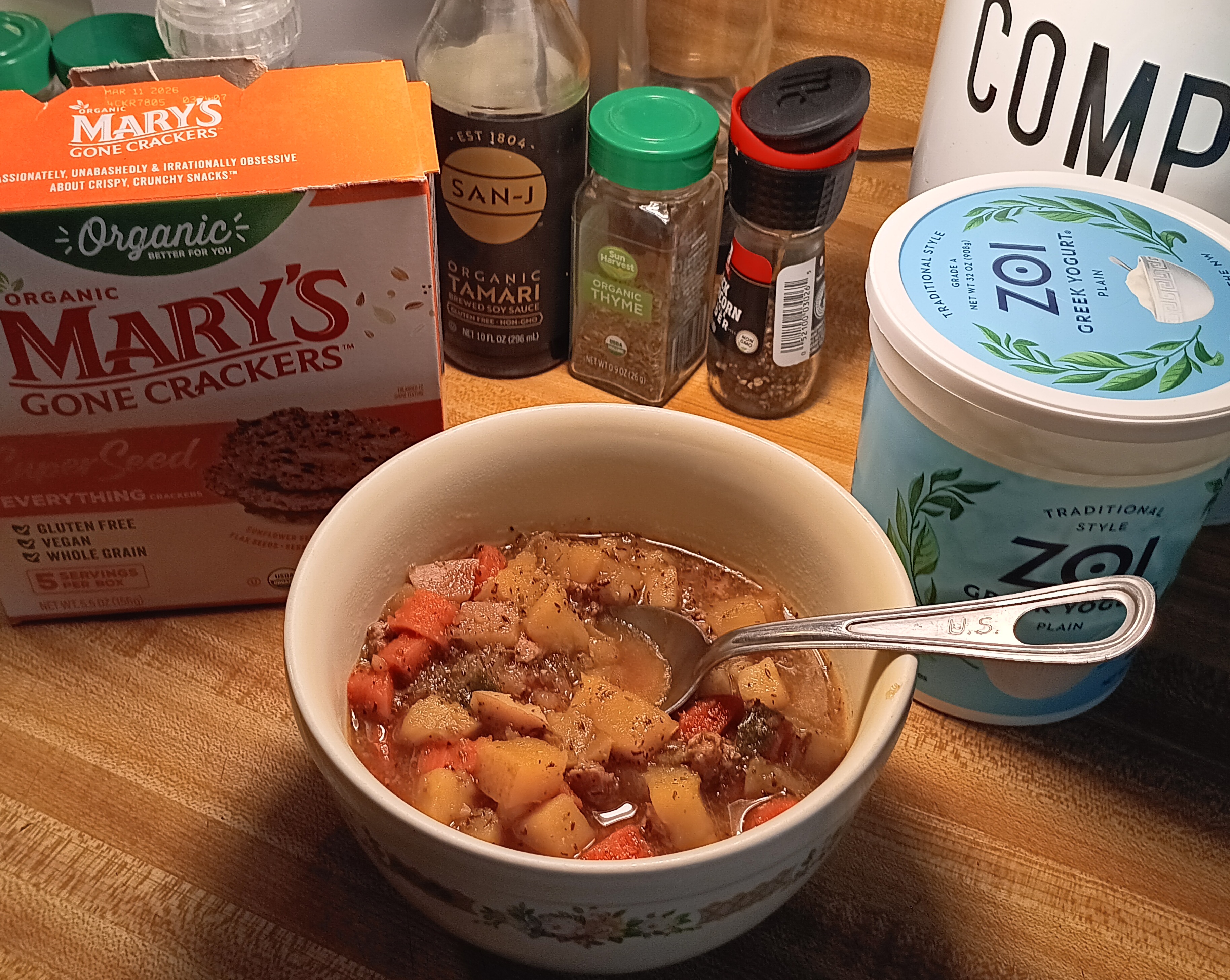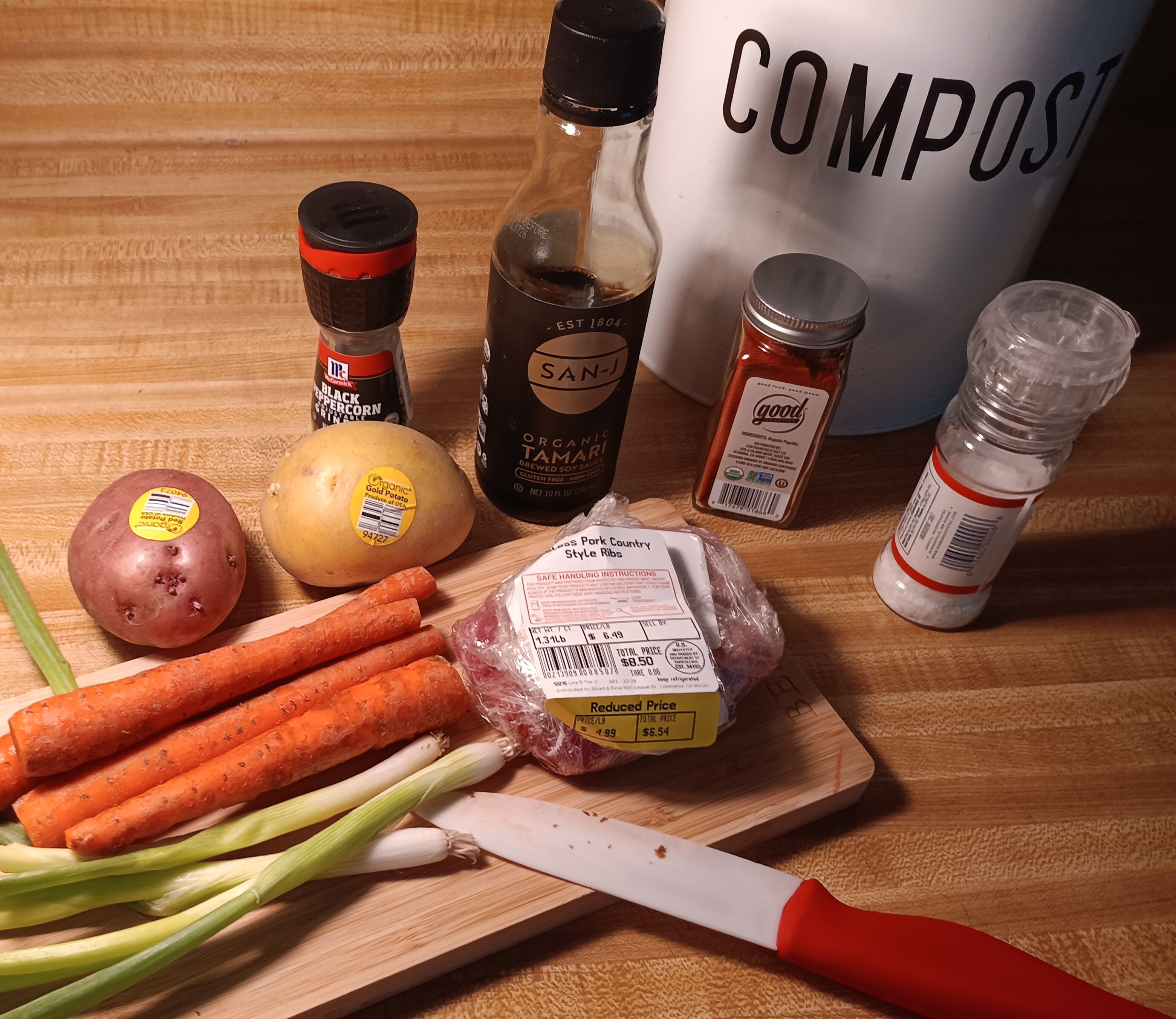 The pork was a day past the ‘Use or Freeze’ date but I gave it the sniff test and it was still good. Everything is organic, because why not?