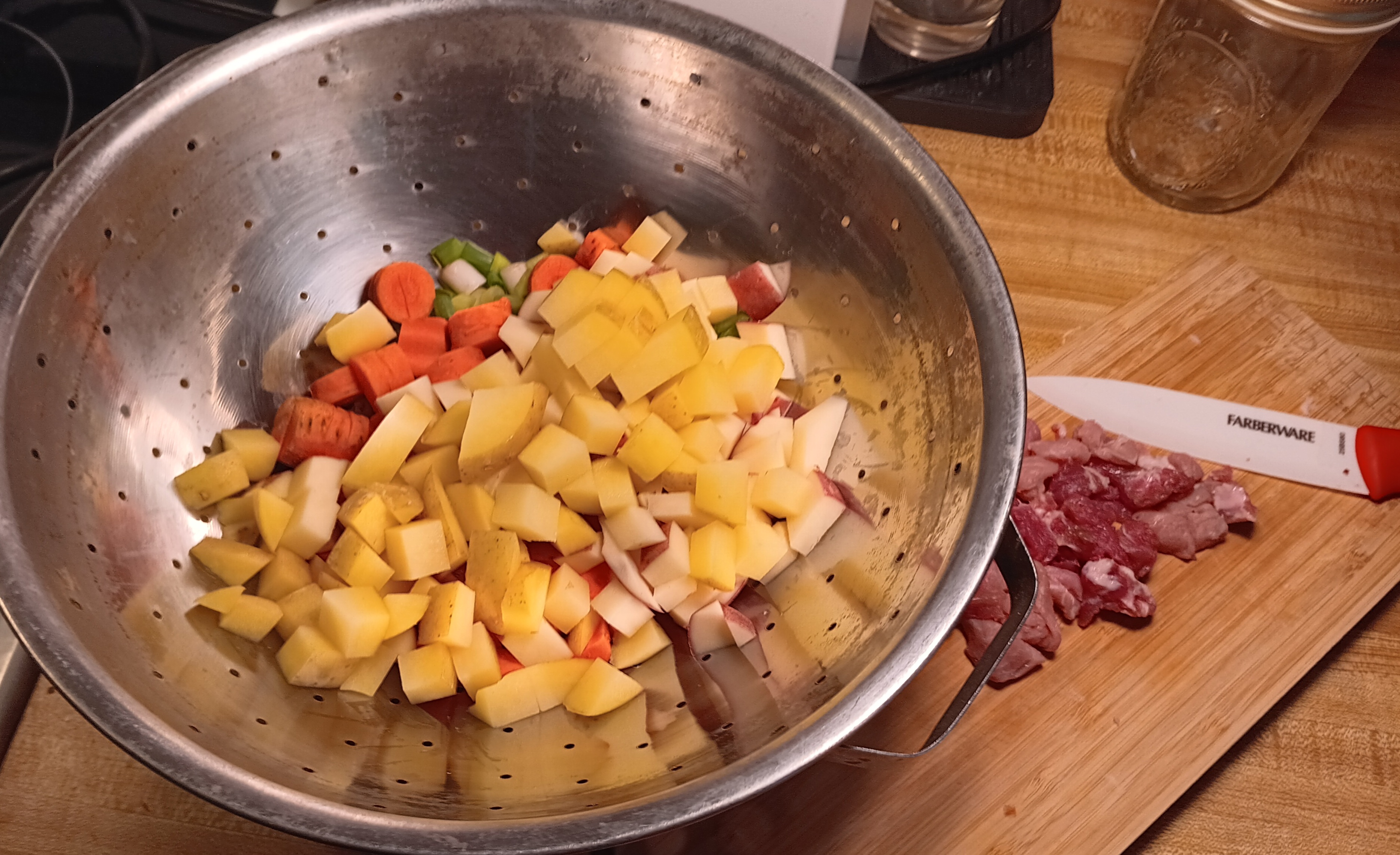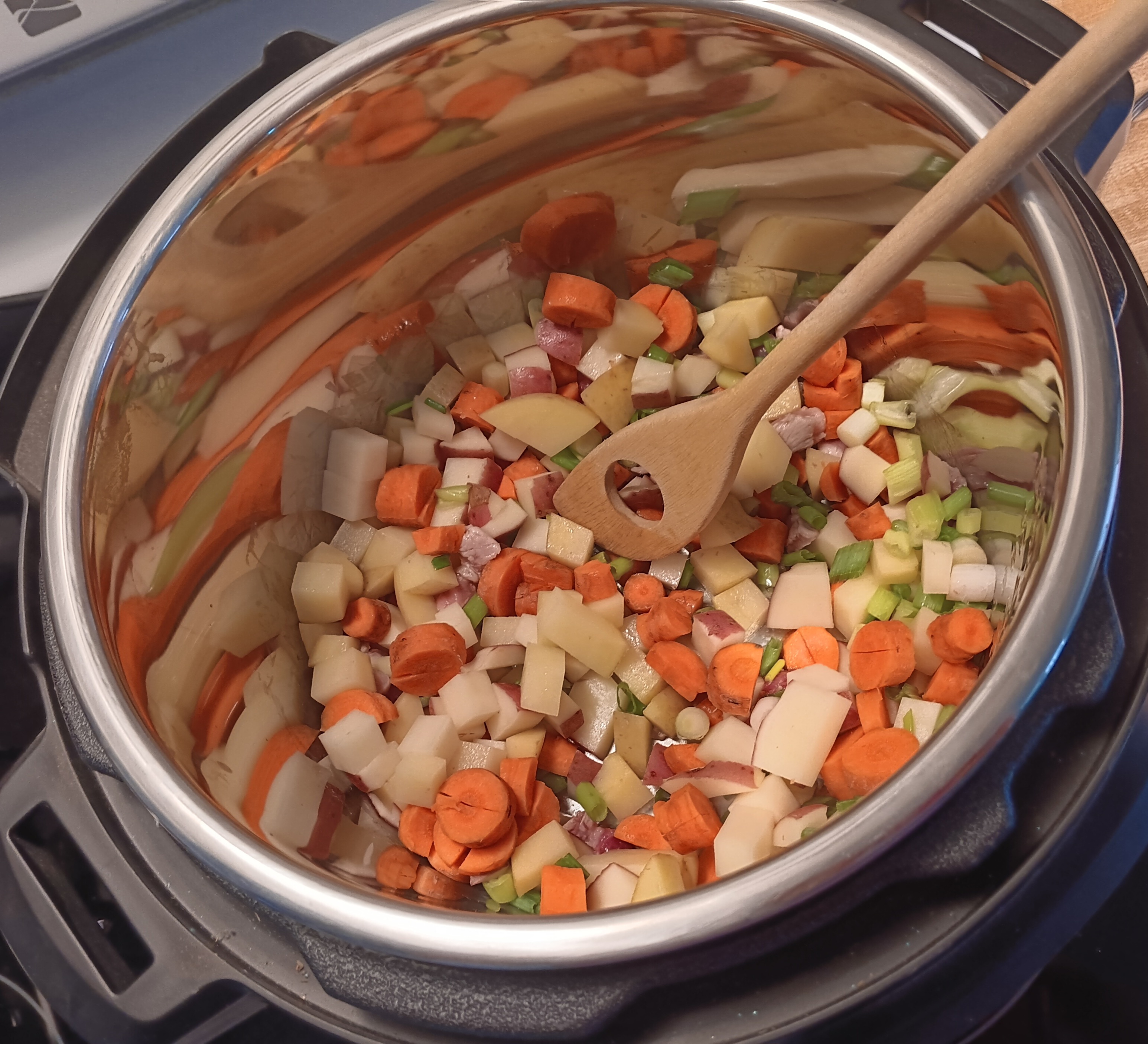 Sis ran me through the sauté setting yesterday so I used it to brown the pork bits in organic olive oil for 2-3 minutes and the vegetables for two more.