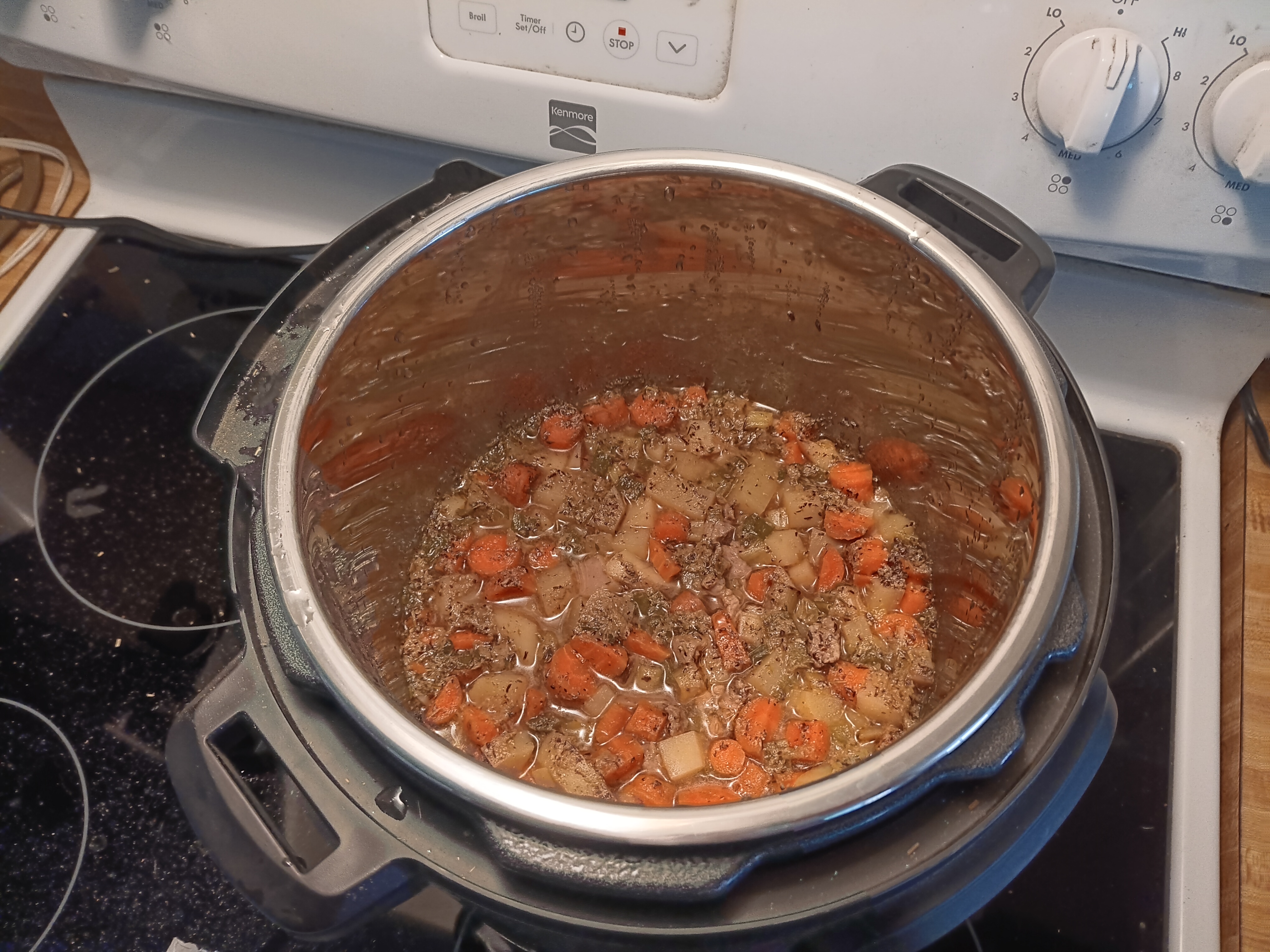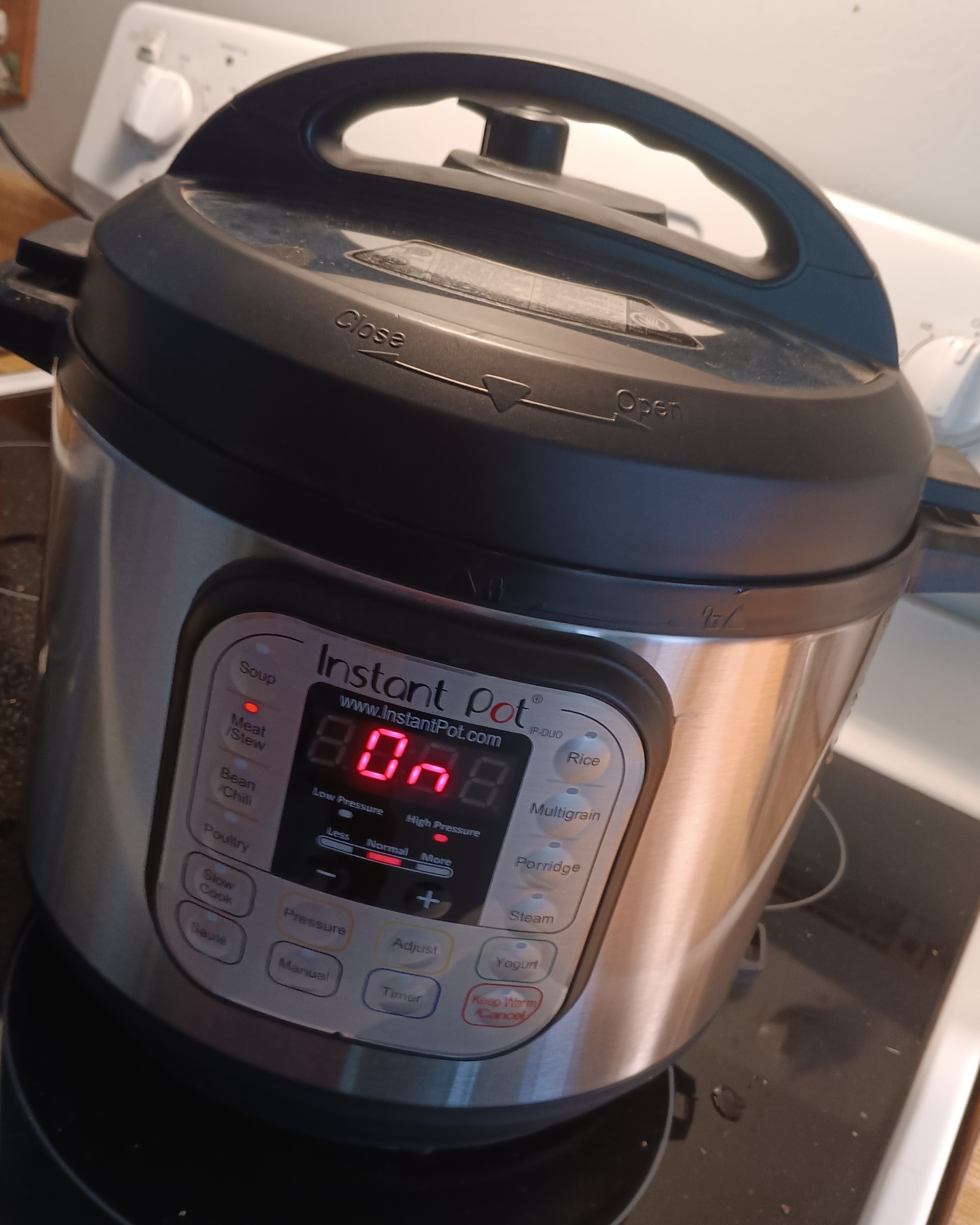 I set it on Meat/Stew with the default 35 minute timing and quickly dumped in two glasses of filtered water because the kitchen was so hot.