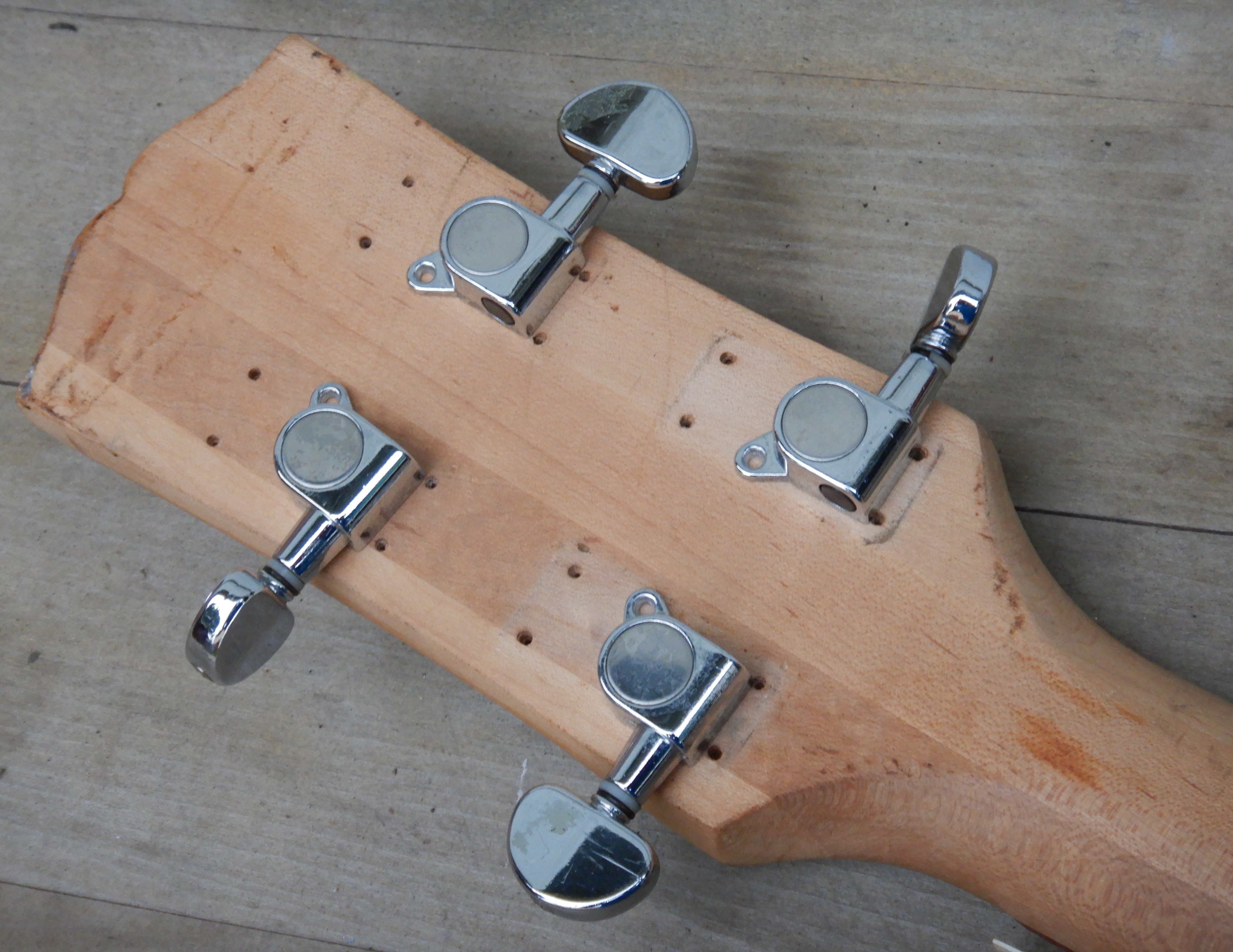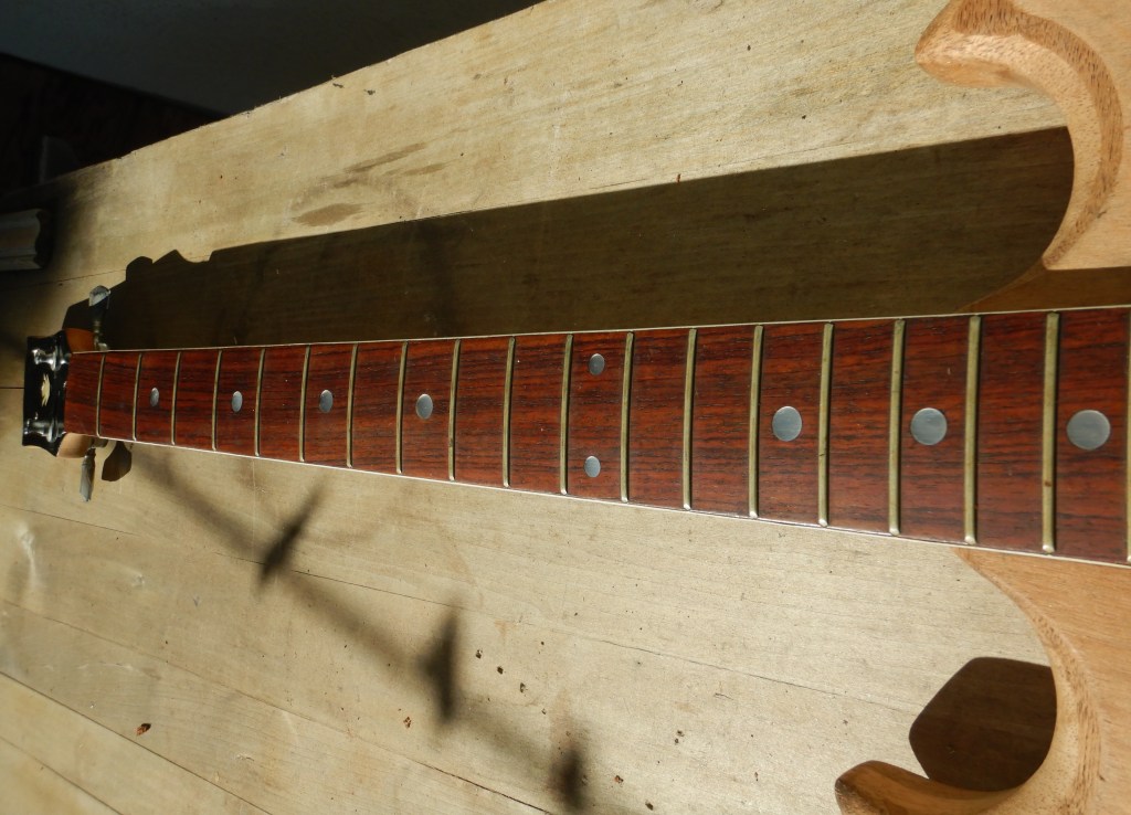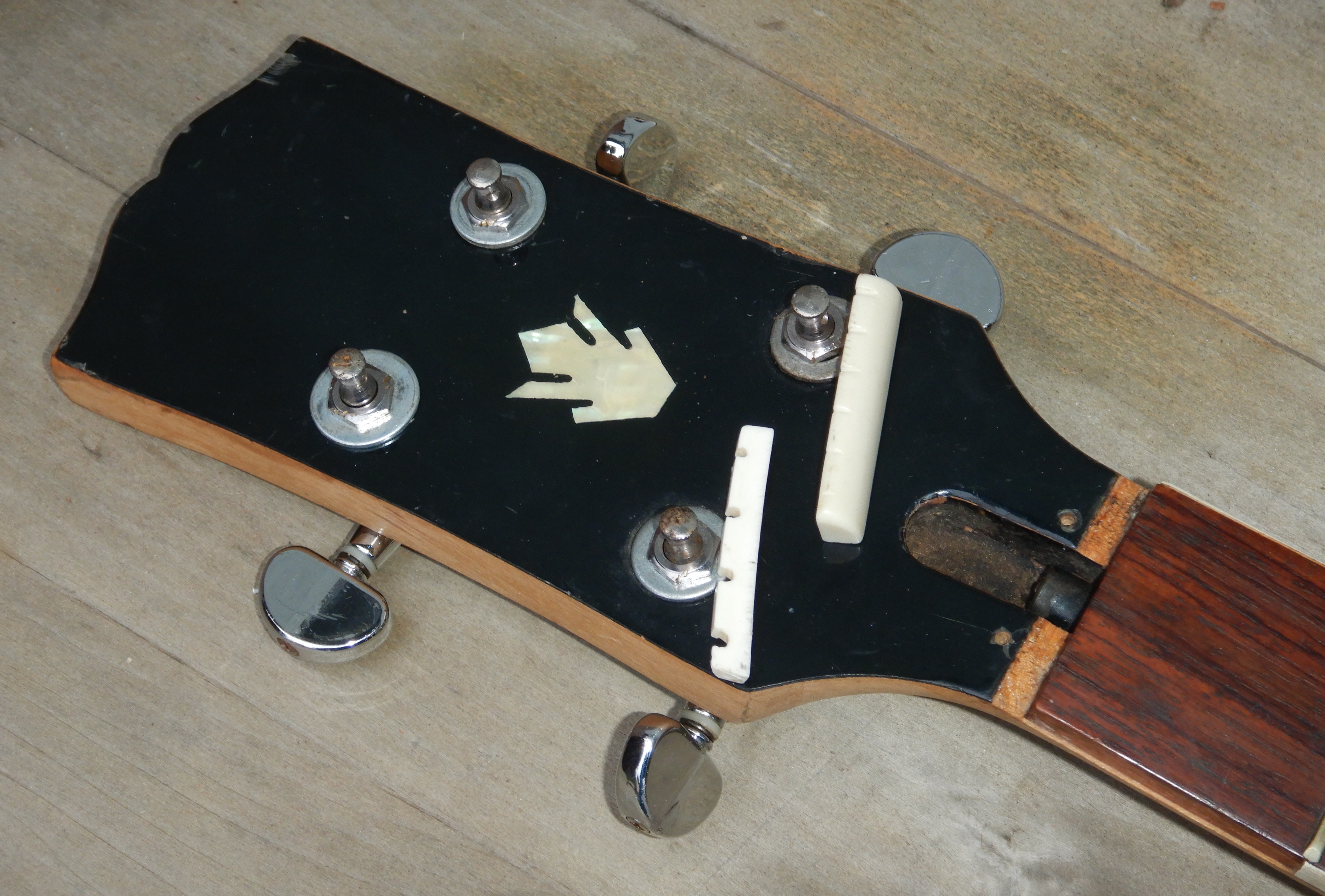 Here’s after I installed four guitar tuners from my bin, and two possible nuts. The torsion rod nut is frozen and rounded off but I’m hoping the light guitar strings will still be usable on it. The neck has a slight up bow so it could work.