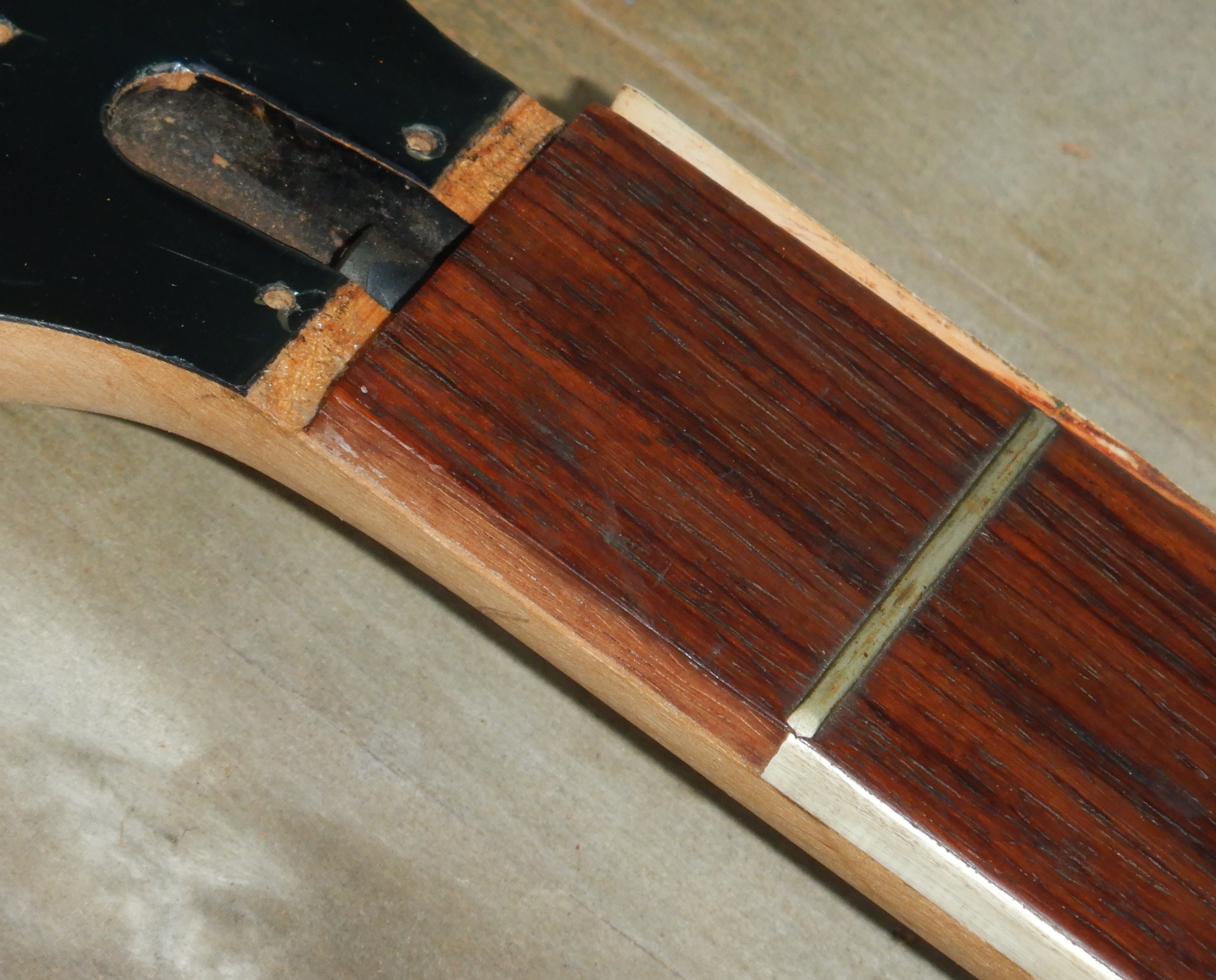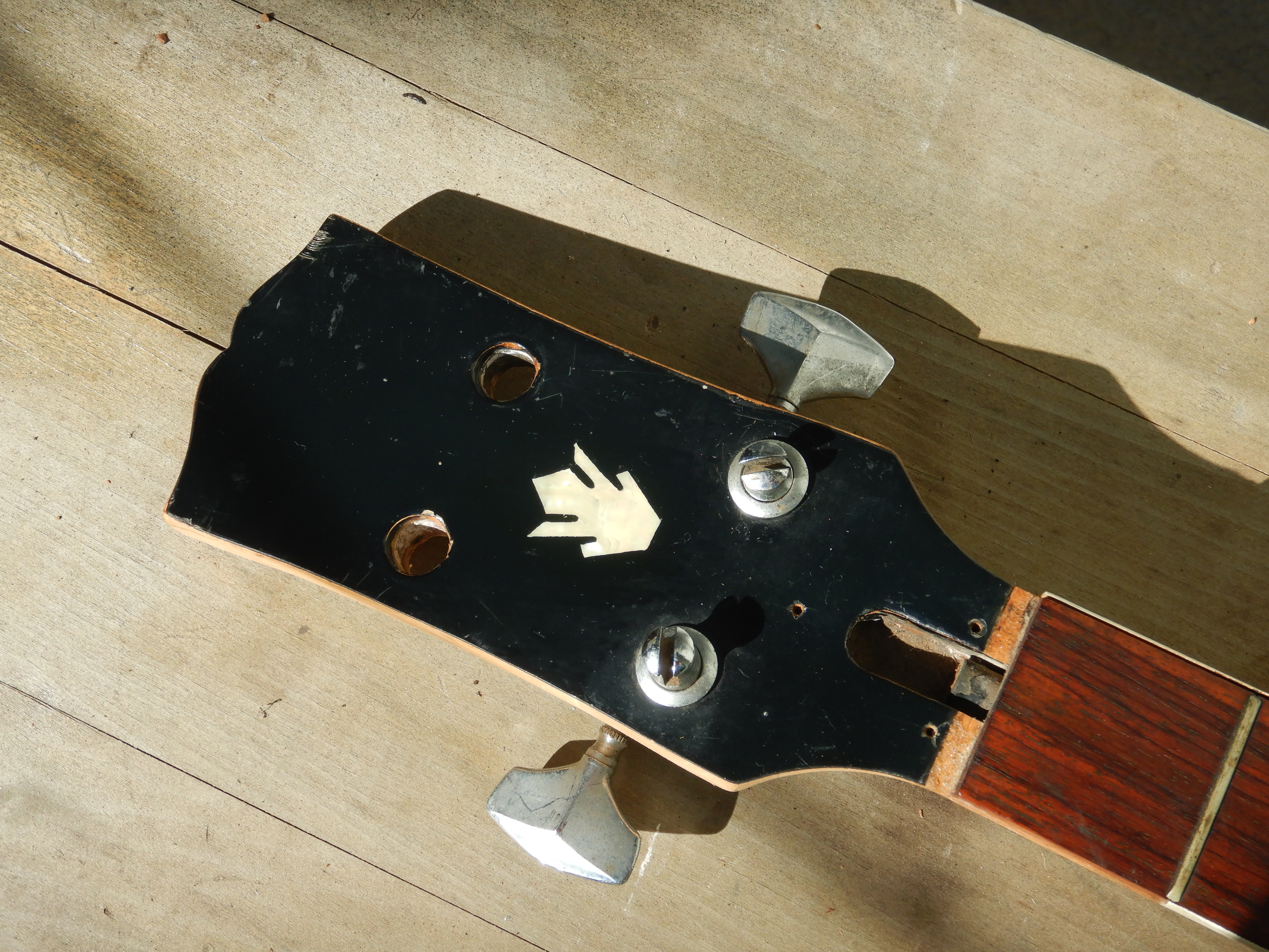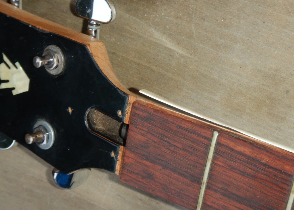 Here’s after I installed four guitar tuners from my bin, and two possible nuts. The torsion rod nut is frozen and rounded off but I’m hoping the light guitar strings will still be usable on it. The neck has a slight up bow so it could work.