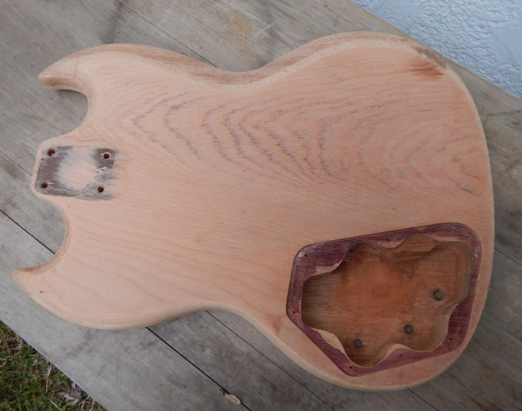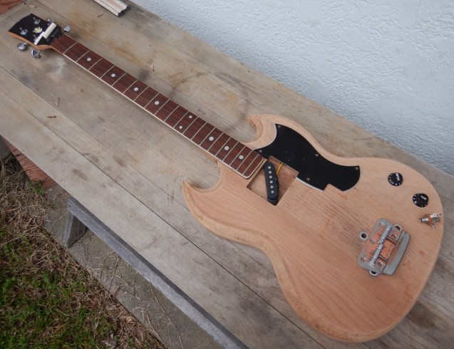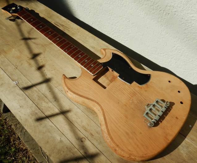 Here’s a Japanese 4-string short-scale bass body and neck I bought from Alex, my Afghanistan music man junk instrument vendor, at Denio’s flea market in Roseville, California for $30.