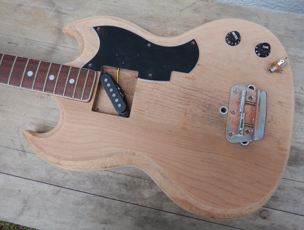After light sanding of the plywood body. Parts I hope to use: 2-saddle ‘vintage’ bridge from another project, straight coil pickup stripped from a Behringer trash find guitar, output jack, and V/T knobs to cover the holes- fakes since I don’t know how to wire things very well and the amp will control everything.